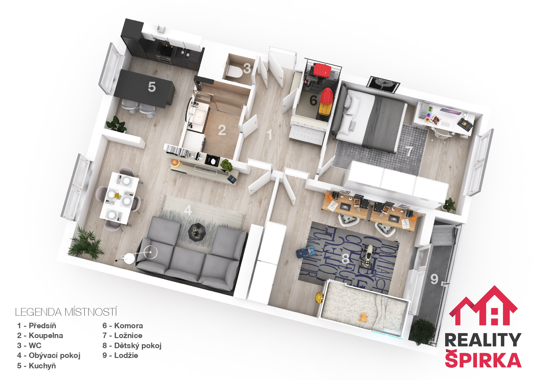 Dispoziční řešení bytu je zobrazeno formou 3D půdorysu v prezentaci.