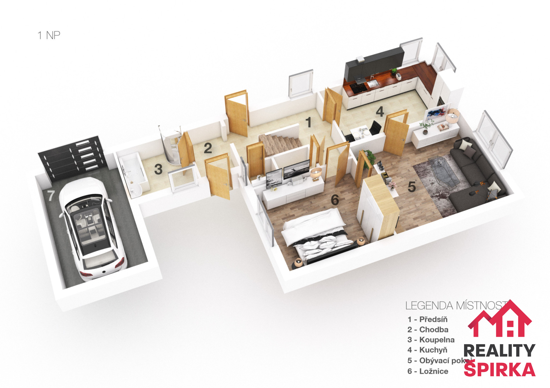 Přízemí je místem, kde se odehrává každodenní život – najdete zde kuchyni s jídelnou, kde se můžete sejít s rodinou, obývací pokoj pro relaxaci, ložnici a koupelnu. Navíc je zde i samostatné WC a přímý vstup na zahradu.