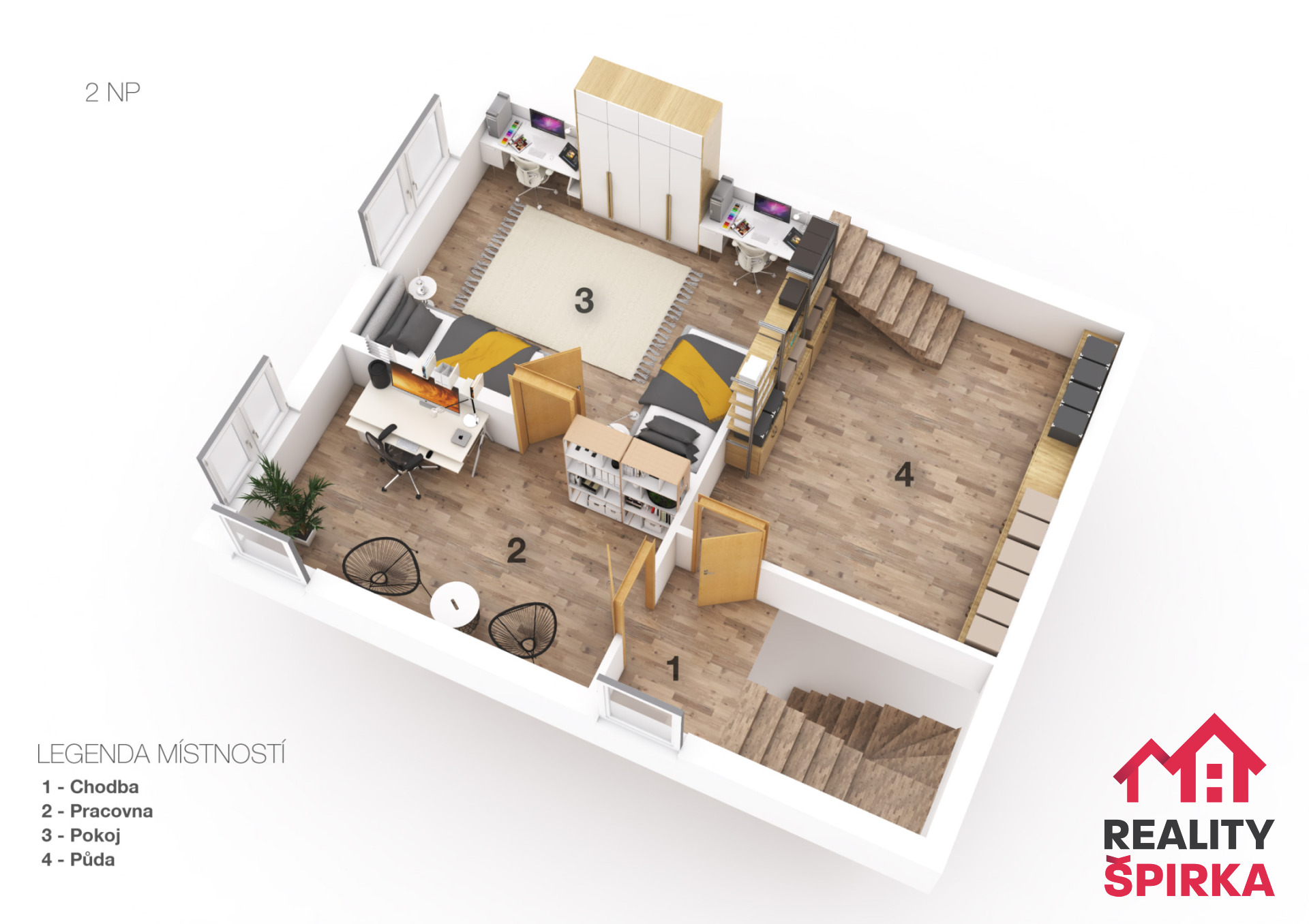 Podkroví nabízí dva útulné pokoje a prostor, který můžete přetvořit podle svých představ – třeba na další pokoj nebo hernu pro děti.