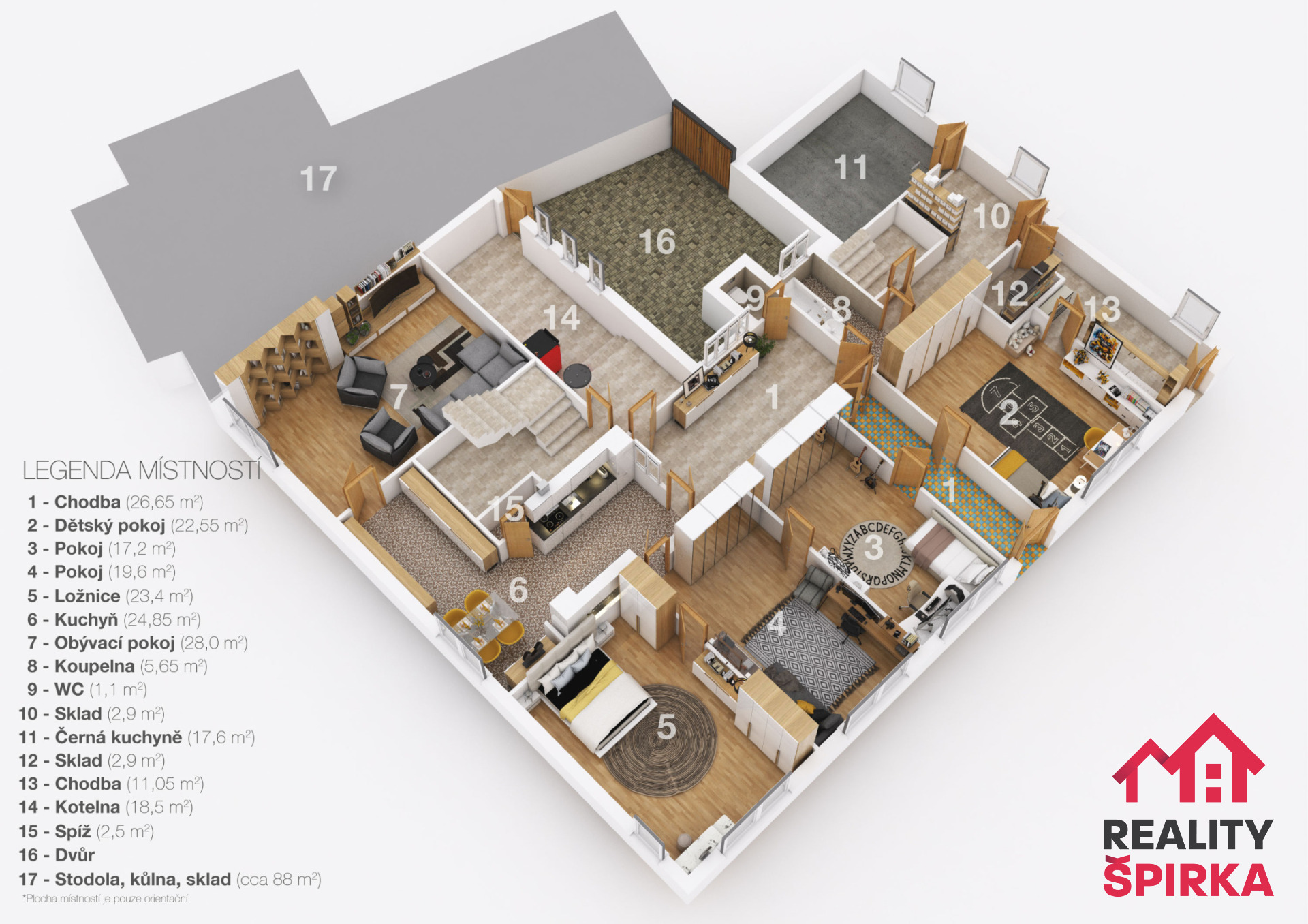 Nabízím k prodeji částečně podsklepený jednopodlažní rodinný dům, který se nachází v obci Banín, vzdálené cca 14 km od Svitav, kde je veškerá občanská vybavenost. V domě je bytová jednotka 6+1, sklady, stodola, kolna a využitelná půda. Dům je situován u hlavní silnice ve střední části obce. Okna domu jsou situována prakticky na všechny světové strany. Dům je napojen na veřejný vodovod, elektro, plynovod, veřejnou kanalizaci a do domu je zavedena tel. přípojka. Vytápění je zajištěno buď kotlem na tuhá paliva nebo plynovým kotlem. Přístup je zajištěn z obecního pozemku. Dům je obyvatelný, plně funkční, přesto je doporučena celková rekonstrukce. Součástí prodeje jsou zahrady a také další rodinný dům určený k demolici. Všechny prodávané pozemky jsou v územní plánu určené pro výstavbu rodinného bydlení, což představuje zajímavý investiční záměr. Okolí obce obklopuje nádherná příroda nabízející letní i zimní aktivity, od koupání, cyklistiky, houbaření, turistiky, rybaření až po lyžování. Dovoluji si Vás pozvat na prohlídku nemovitosti, kde Vám sdělím další informace. Zdarma Vám zajistím výhodné financování, převod energií, případně další služby.