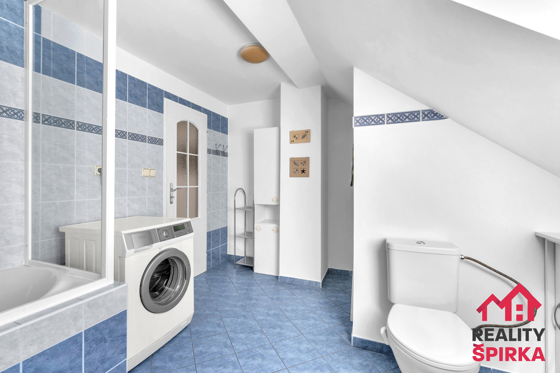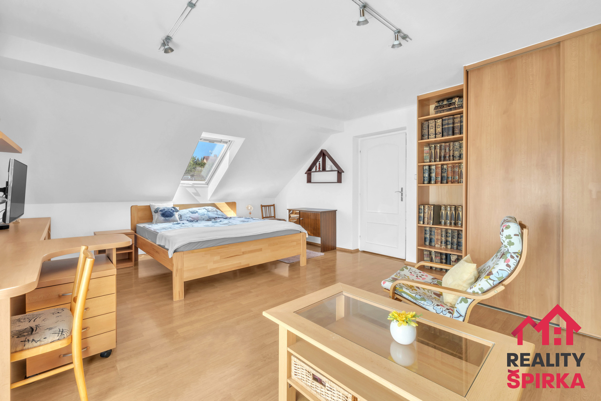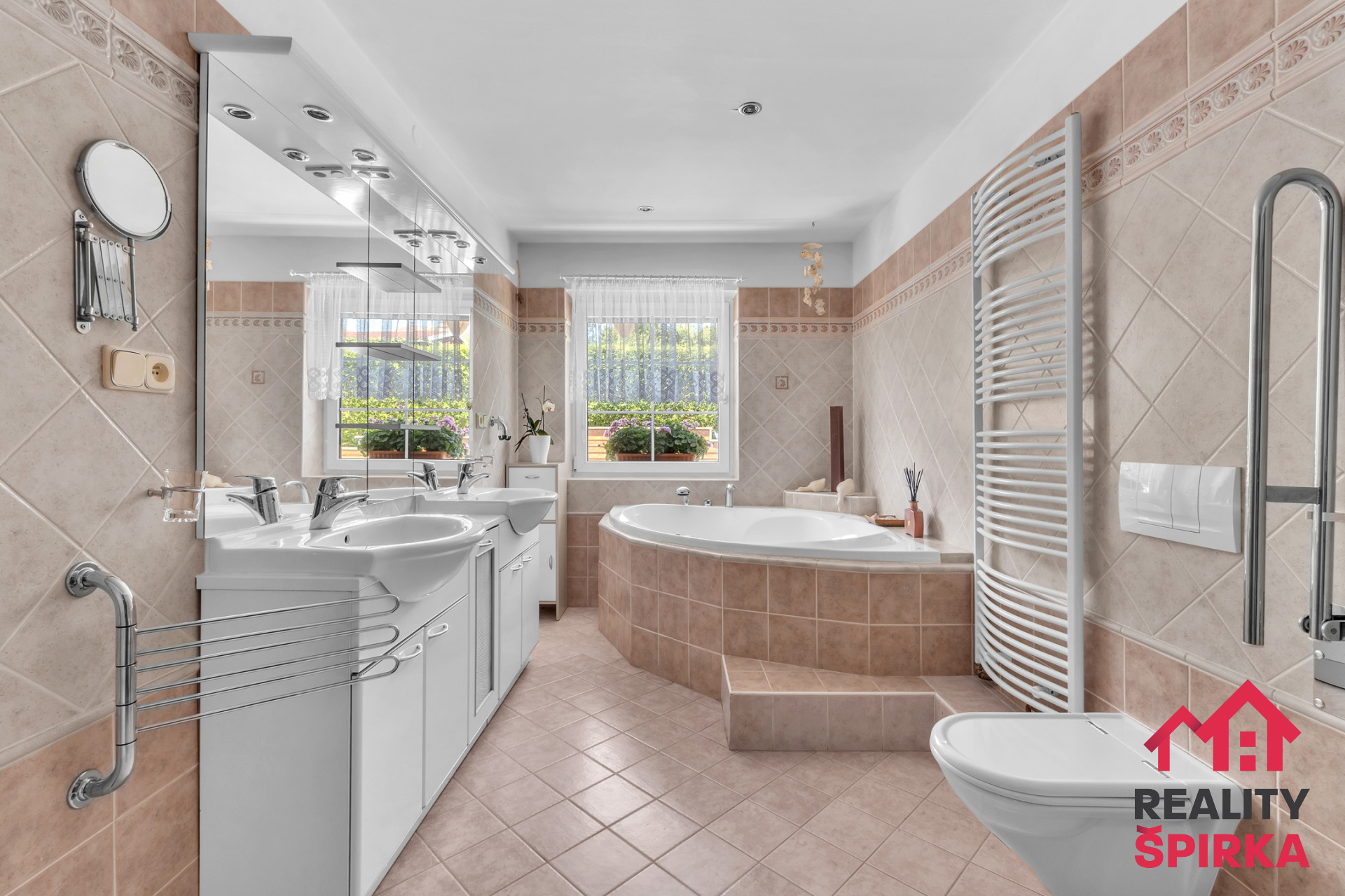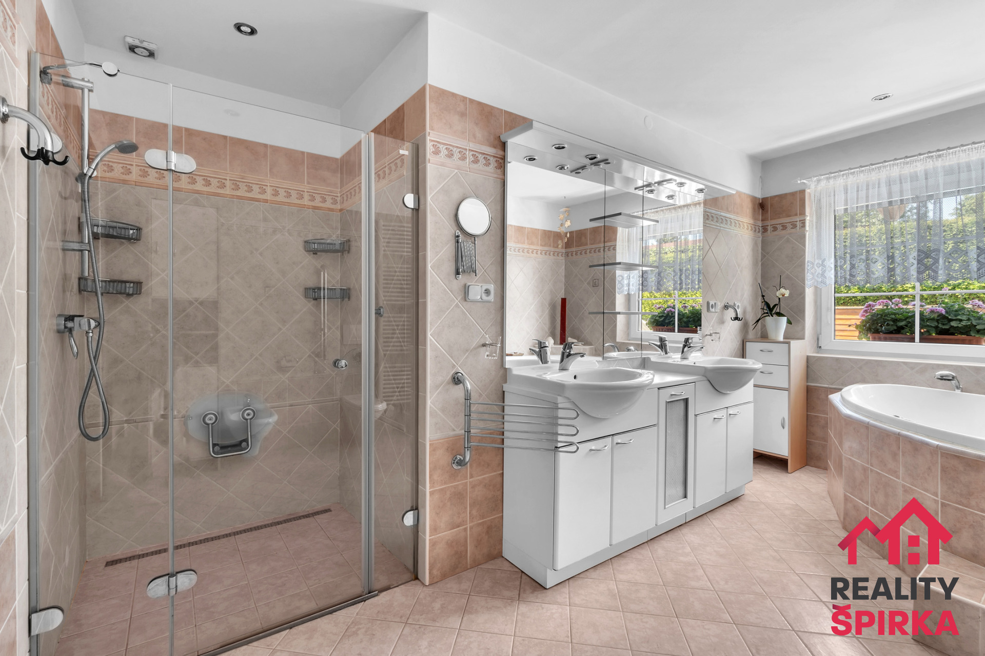 Přízemí: výměra cca 122 m2 - obývací kuchyně, obývací pokoj, ložnice s výstupem do zimní zahrady, pracovna s šatnou, prostorná chodba s úložným prostorem, bezbariérová koupelna s rohovou vanou, sprchovým koutem a WC, prádelna, samostatné WC. Podkroví: výměra cca 111 m2 - 2x prostorný dětský pokoj s vlastní šatnou, ložnice s vlastní šatnou, pracovna či pokoj pro hosty, koupelna s vanou a WC.